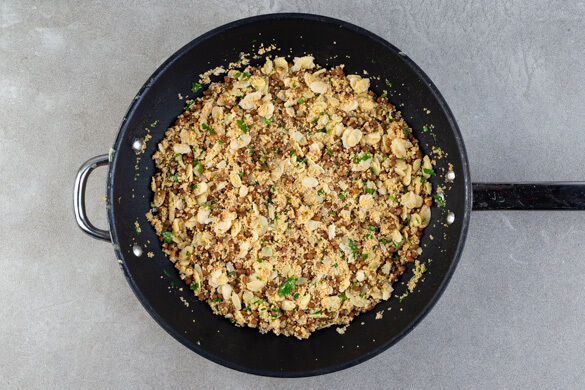 Den Couscous mit 1TL Zitronensaft, 1TL Zitronenabrieb und der 1/2 der gehackten Kräuter zu den Linsen geben und mit 1 Prise Salz und Zucker würzen. Mit 300ml kochendem Wasser übergießen und den Couscous ohne Hitzezufuhr 8–10Min. ziehen lassen.