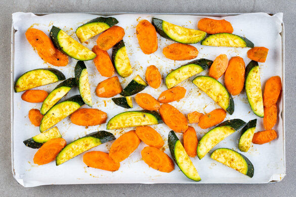 Das Gemüse auf einem mit Backpapier ausgelegten Backblech mit 1EL Olivenöl und der Gewürzmischung vermengen, gleichmäßig verteilen und 15–20Min. im Ofen rösten, bis die Karotten gar und die Zucchini goldbraun sind.