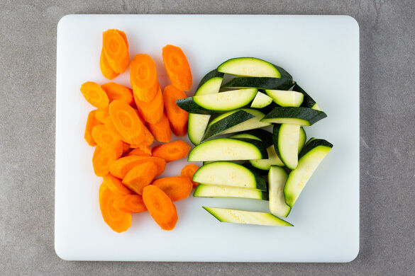 Den Backofen auf 200°C Umluft (220°C Ober-/Unterhitze) vorheizen. Die Karotte ggf. schälen und schräg in 0,5–1cm dicke Scheiben schneiden. Die Zucchini längs halbieren und ebenfalls schräg in 0,5–1cm dicke Scheiben schneiden.