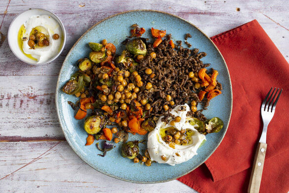Hast du schon einmal Rosenkohl mit Zwiebeln, Karotten und Kichererbsen gebacken und dazu knusprig gebratenes Hackfleisch serviert? Nein? Dann wird es Zeit – finden wir –, denn es schmeckt hervorragend! Für den besonderen Geschmack sorgen orientalische Gewürze und Oregano, die Abkühlung kommt von Zitrone und frischem Joghurt. Ein bunter Strauß Aromen, der nur darauf wartet, von dir erkocht zu werden!