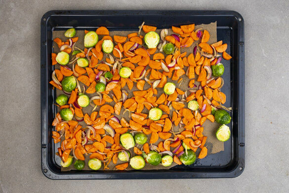 Den Rosenkohl, die Karotten und die Zwiebeln auf einem mit Backpapier ausgelegten Backblech mit 1EL Olivenöl und je 1 Prise Salz und Pfeffer vermengen, gleichmäßig verteilen und ca. 10Min. im Ofen rösten.