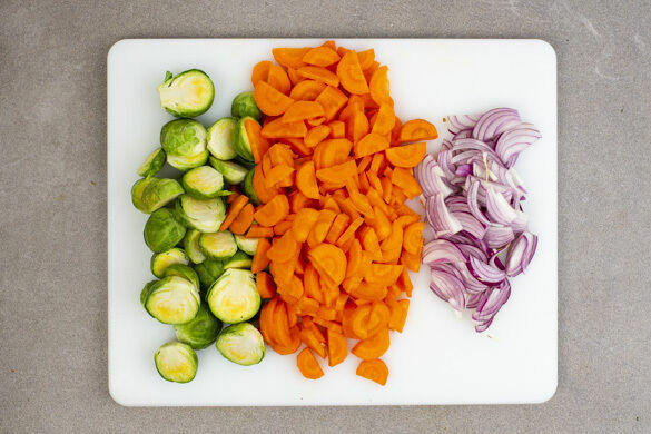 Den Backofen auf 220°C Umluft (240°C Ober-/Unterhitze) vorheizen. Den Rosenkohl am Strunk abschneiden und die Röschen halbieren. Die Karotten schälen, längs halbieren und in dünne Scheiben schneiden. Die Zwiebel schälen, halbieren und der Länge nach in dünne Streifen schneiden.