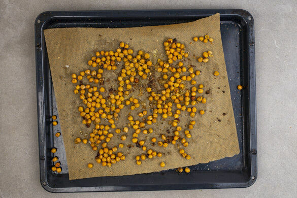Wenn das Gemüse 10Min. gebacken hat, die Kichererbsen ebenfalls in den Ofen geben und alles noch 15–20Min. rösten, bis das Gemüse gar ist und die Kichererbsen knusprig sind. Tipp: Wer einen Ofen mit Grillfunktion hat, kann die Kichererbsen noch kurz unter den Grill schieben, damit sie besonders knusprig werden, aber bitte aufpassen, dass sie nicht verbrennen.