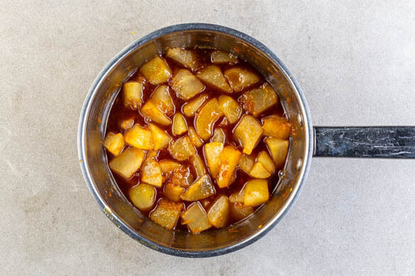 Die Birnen, die Orangenschale, den Orangensaft, 150g Zucker, den Zimt und 150ml Wasser in einem kleinen Topf vermengen, bis sich der Zucker auflöst. Bei starker Hitze aufkochen und anschließend bei mittlerer Hitze 10–15Min. einköcheln lassen, bis das Kompott eine karamellartige Konsistenz hat. Gelegentlich umrühren.