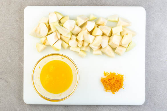 Die Birnen schälen, vierteln, entkernen und in mundgerechte Stücke schneiden. Die Orangenschale abreiben, dann die Orange halbieren und auspressen.