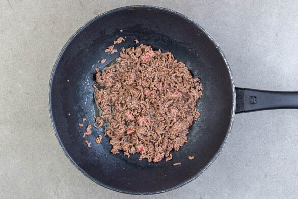 Das vegane Hack in einer großen Pfanne oder einem Wok mit 1EL Pflanzenöl bei starker Hitze 2–3Min. anbraten.