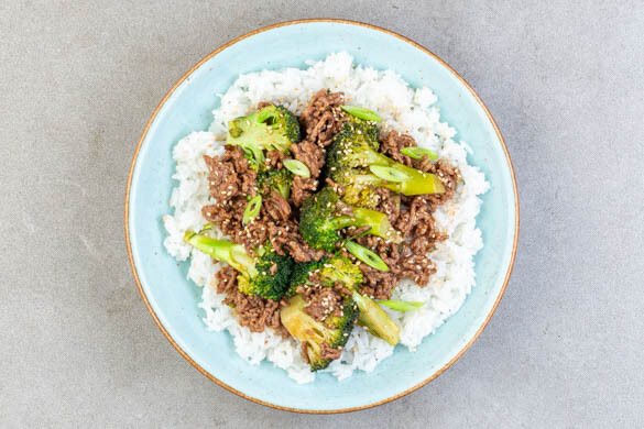 Die Brokkoli-Hack-Mischung auf dem Reis anrichten und mit den Lauchzwiebeln und dem Sesam garniert servieren.