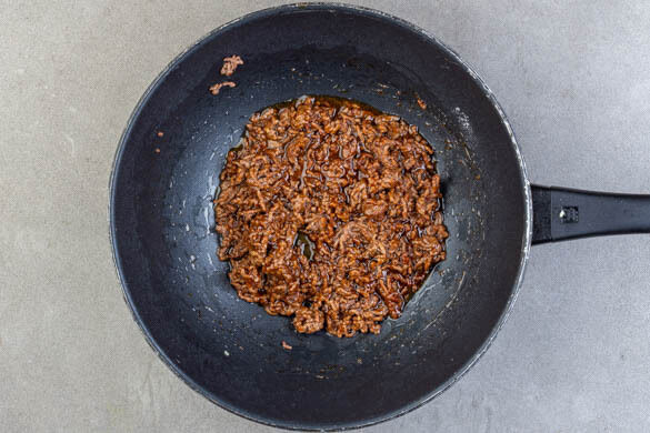 Das vegane Hack in einer großen Pfanne oder einem Wok mit 2EL Pflanzenöl bei starker Hitze 2–3Min. anbraten.