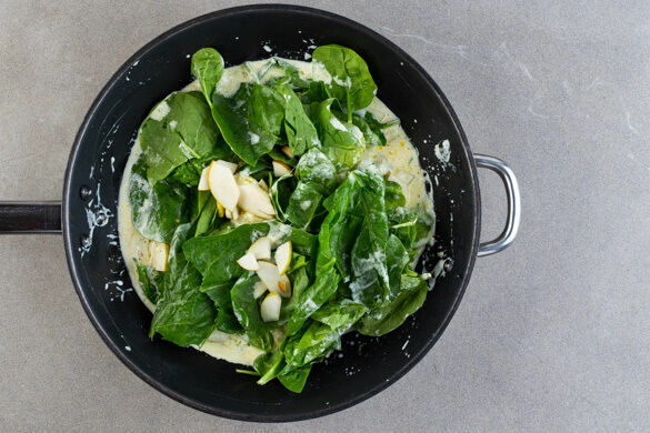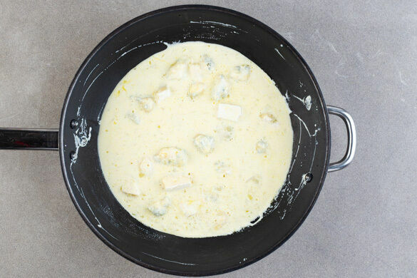 Die Zwiebeln in der Pfanne mit 1EL Olivenöl bei mittlerer Hitze 2–3Min. glasig anschwitzen. Die Crème fraîche unterrühren und 3–4Min. köcheln lassen. Dann die 1/2 des Käses in die Pfanne bröseln, unterrühren und die Sauce noch kurz weiter köcheln lassen, bis der Käse geschmolzen ist. Tipp: Wer mag, kann auch mehr Käse verwenden.