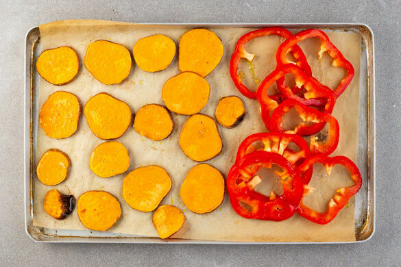 Den Backofen auf 200°C Umluft (220°C Ober-/Unterhitze) vorheizen. Die Süßkartoffeln ggf. schälen und in höchstens 0,5cm dünne Scheiben schneiden. Auf einem mit Backpapier ausgelegten Backblech mit 1–2EL Pflanzenöl, 1/2TL Salz und 1 Prise Pfeffer vermengen, gleichmäßig verteilen und 10Min. im Ofen vorbacken.