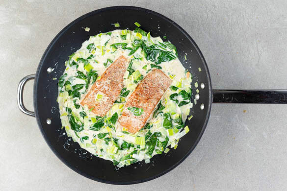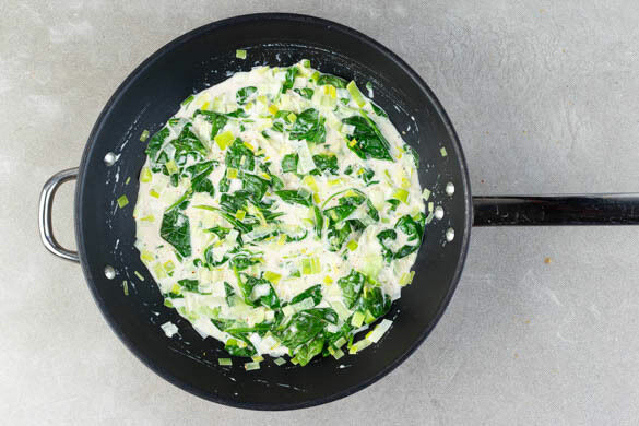 Eine große Pfanne bei mittlerer Hitze ohne Zugabe von Fett erwärmen. Den Lauch, den Spinat und die Kokosmilch in die warme Pfanne geben, mit der restlichen Cajun-Gewürzmischung und 1/2–1TL Salz würzen und ca. 4Min. köcheln lassen.