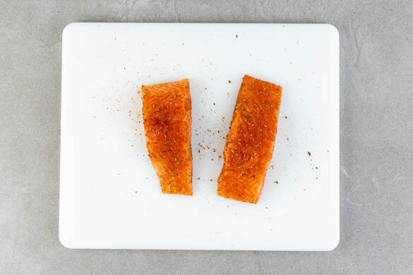 Den Fisch mit kaltem Wasser abspülen, trocken tupfen und evtl. vorhandene Gräten entfernen. Dann mit 1 Päckchen Cajun-Gewürzmischung rundum einreiben.