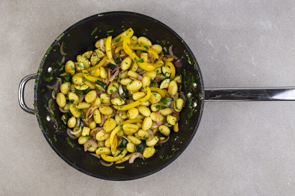 Die Zucchini und die Paprika in einer großen Pfanne mit 1EL Öl bei mittlerer Hitze 2Min. anbraten. Die Zwiebeln und den Knoblauch 1Min. mitbraten. Das Gemüse herausnehmen und die Gnocchi mit 1–2EL Öl knusprig anbraten. Das Gemüse zurück in die Pfanne geben und mit den Kräutern, Salz und Pfeffer würzen. Das Fleisch mit der Sauce und den Gnocchi servieren.
