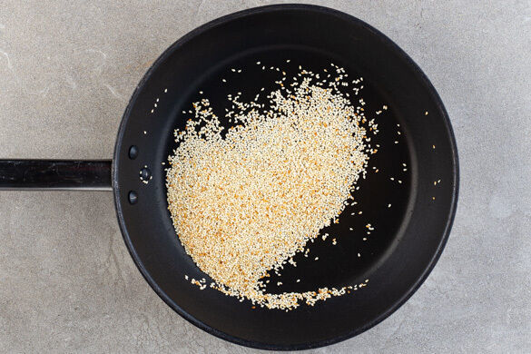 Den Sesam in einer großen Pfanne bei mittlerer Hitze 1–2Min. anrösten. Vorsicht, er kann schnell zu dunkel werden. Den Sesam aus der Pfanne nehmen und beiseitestellen.