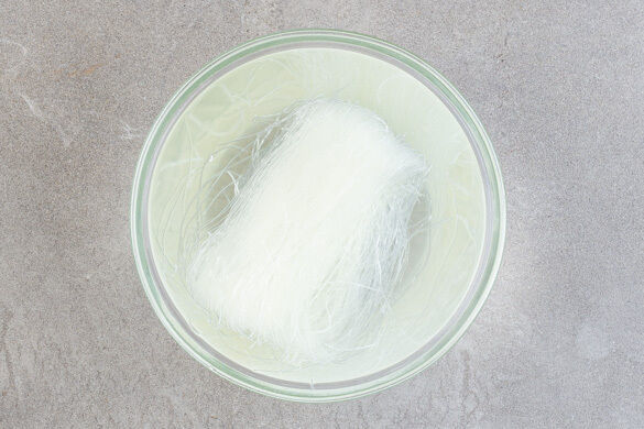 Die Nudeln mit dem kochenden Wasser übergießen, 1 Prise Salz unterrühren und die Nudeln 2–3Min. im heißen Wasser ziehen lassen. In ein Sieb abgießen, kalt abspülen und abtropfen lassen.