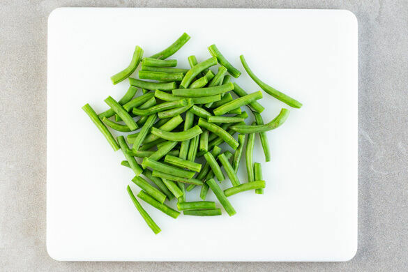 Die Enden der Bohnen abschneiden und die Bohnen quer halbieren.