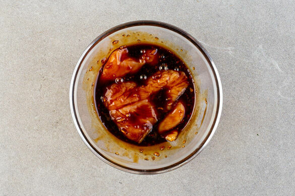 In einem großen Topf ausreichend gesalzenes Wasser für die Bohnen und die Nudeln zum Kochen bringen. Den Knoblauch schälen, sehr fein würfeln oder durch eine Knoblauchpresse drücken und mit der Teriyakisauce und 1EL Essig verrühren. Das Fleisch trocken tupfen, horizontal halbieren und mit der 1/2 der Würsauce einreiben. Die restliche Würzsauce beiseitestellen.