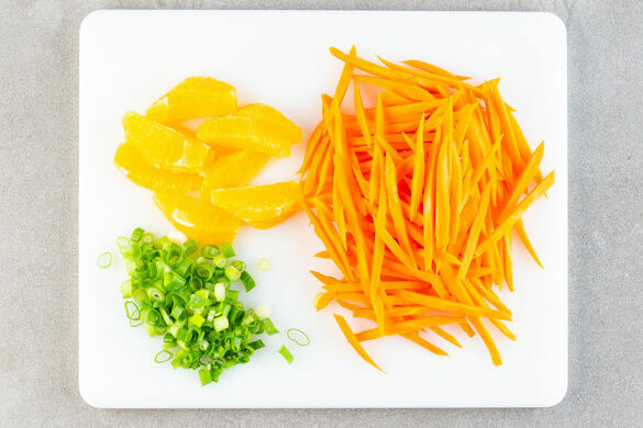 Die Orangenschale so herunterschneiden, dass die weiße Haut vollständig vom Fruchtfleisch entfernt wird. Anschließend die Filets vorsichtig aus den weißen Zwischenräumen schneiden. Die Lauchzwiebel in feine Ringe schneiden. Die Karotte ggf. schälen und mit einer Küchenreibe grob raspeln.