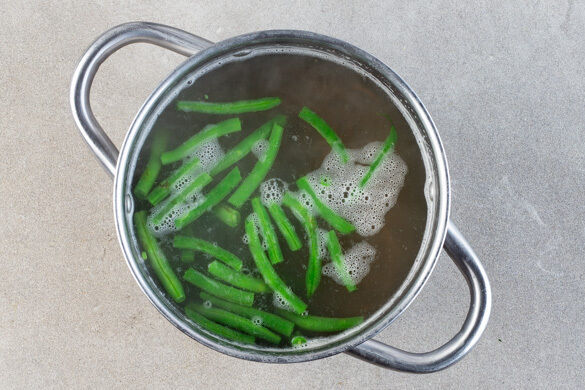 Die Bohnen in das kochende Wasser geben und 6–8Min. abgedeckt bei starker Hitze kochen lassen. Die Nudeln nach 3Min. hinzugeben, gut unterrühren und die restliche Garzeit mitkochen lassen. Die Bohnen und die Nudeln in ein Sieb abgießen und gründlich mit kaltem Wasser abschrecken.