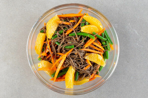 Die restliche Würzsauce mit dem Sesamöl, 1–2EL Essig und 1/2TL Salz verrühren und die Nudeln, die Bohnen, die Orangen und die Karotten mit dem Dressing vermengen. Das Fleisch in Tranchen schneiden, auf dem Salat anrichten und mit den Lauchzwiebeln garniert servieren