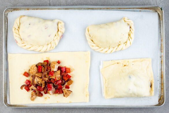 Die Teige mit dem Papier nach unten auf zwei Backblechen ausrollen und jeweils mittig vierteln. Die Füllung gleichmäßig auf den Rechtecken verteilen, dann den Teig so darüber zusammenfalten, dass kleine Teigtaschen entstehen. Die Ränder entweder dekorativ zusammenfalten oder mit einer Gabel fest verschließen. Die Empanadas 13–15Min. im Ofen goldbraun backen.