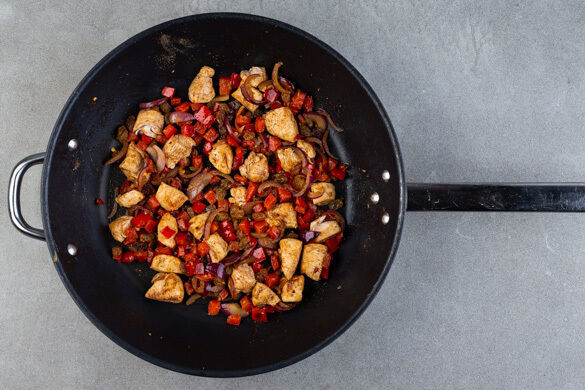 Das Fleisch mit etwas Küchenkrepp trocken tupfen und in einer großen Pfanne mit der Paprika, der 1/2 der Zwiebeln, dem Knoblauch und den Rosinen in 1EL Pflanzenöl bei starker Hitze 4–5Min. anbraten. Mit der Gewürzmischung und 1/2TL Salz abschmecken. Die vorbereitete Füllung am besten auf einem großen Teller z. B. an einem offenen Fenster abkühlen lassen.