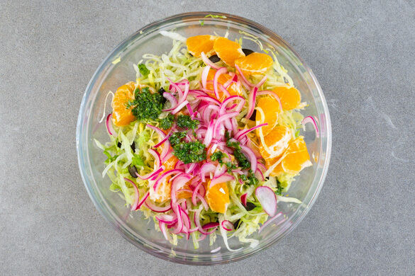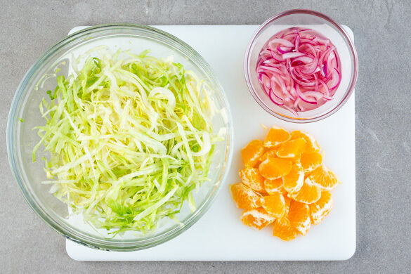 Inzwischen die restlichen Zwiebeln mit 100ml warmem Wasser, 2EL Essig und 1TL Salz vermengen und beiseitestellen. Den Salat in feine Streifen schneiden, dabei den Strunk entfernen. Die Mandarinen schälen, die einzelnen Segmente voneinander lösen und einmal durchschneiden.