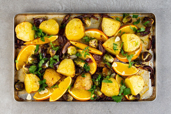 Die Orangen nach 5Min. ebenfalls auf das Blech geben. Nach weiteren 15Min. den Knoblauch dazugeben und mitbacken.