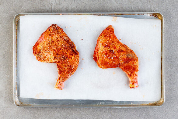 Den Backofen auf 200°C Umluft (220°C Ober-/Unterhitze) vorheizen. Die Hähnchenschenkel trocken tupfen und rundum mit dem Paprikapulver, 1TL Salz und 1 Prise Pfeffer einreiben. Auf einem mit Backpapier ausgelegten Backblech ca. 35Min. im Ofen backen, sobald er heiß ist. Während des Garens 2–3-mal wenden, die letzten Minuten aber mit der Hautseite nach oben legen.