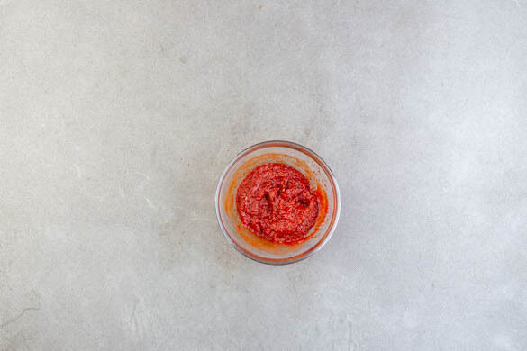 Den Knoblauch schälen und fein würfeln. Das Tomatenmark mit dem Knoblauch, der Gewürzmischung, 4EL Olivenöl, 2TL Essig und 6–8EL Wasser zu einer Pizzasauce verrühren und mit Salz und Pfeffer abschmecken.