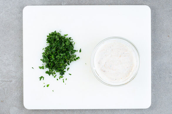 Die Petersilie samt Stängeln fein hacken. Den Joghurt mit 1–2TL Ras el-Hanout verrühren und mit Salz und Pfeffer abschmecken.
