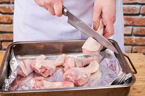 Wer einen Grill verwendet, diesen vorheizen. Ansonsten Ofen auf 250°C Grill vorheizen. Hühnchenkeulen mehrfach bis zum Knochen einschneiden. Auflaufform nun mit etwas Alufolie auslegen, das Fleisch darin mit etwas Olivenöl, Salz und Pfeffer würzen und für ca. 10Min. im Ofen vorgaren. Oder 10Min. bei mittlerer Hitze ohne Auflaufform auf dem Grill grillen.