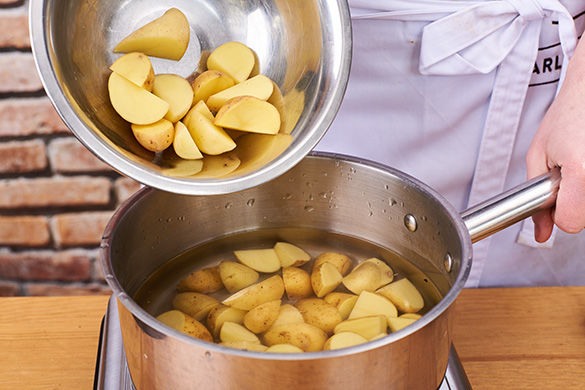 Inzwischen die Kartoffeln der Länge nach halbieren und in ausreichend, gesalzenem Wasser zum Kochen bringen. Für ca. 10-15Min. bissfest garen. Schließlich durch ein Sieb abgießen und ausdampfen lassen.