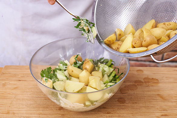 Die gekochten Kartoffeln in die Salatschüssel aus Schritt 4 geben und mit den übrigen Zutaten gut vermengen. Schließlich mit Salz und Pfeffer erneut abschmecken. Zusammen mit dem Fenchel und den Hühnchenkeulen servieren.