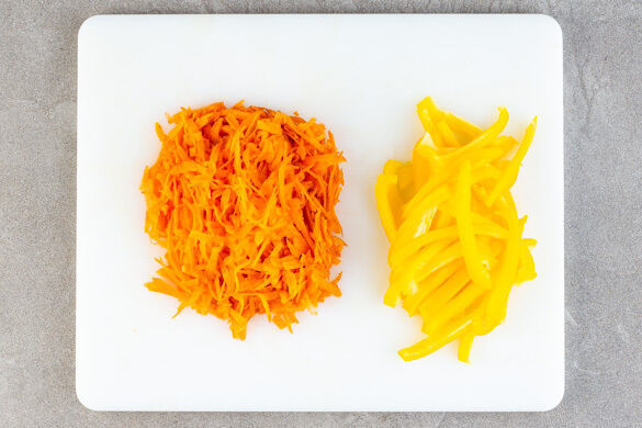 Die Karotte ggf. schälen und mit einer Küchenreibe grob raspeln. Die Paprika vierteln, entkernen und in dünne Streifen schneiden.