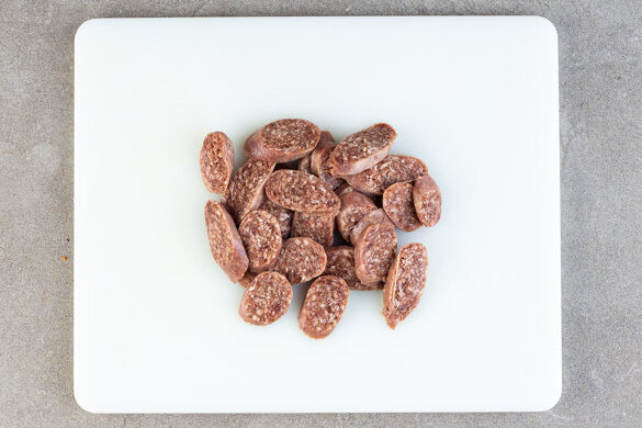 Die Würste schräg in dünne Scheiben schneiden.