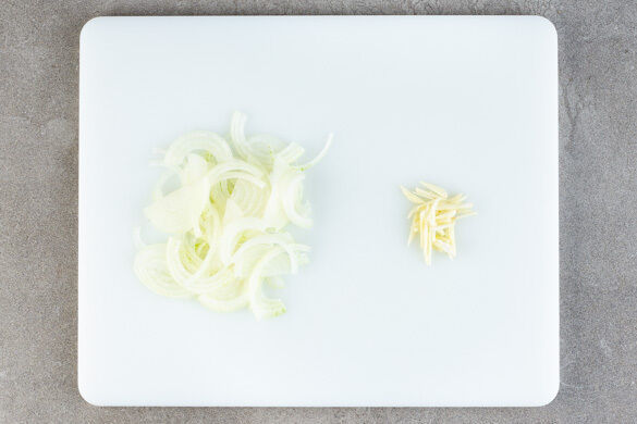 Die Zwiebel schälen, halbieren und in feine Streifen schneiden. Den Knoblauch schälen und in dünne Stifte schneiden.