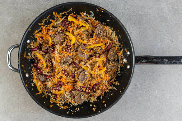 Heute servierst du eine ganze Pfanne voller Köstlichkeiten: Unser Gemüse mit gebratener Rindswurst, farbenfrohen Kidneybohnen und fluffiger Quinoa zauberst du im Handumdrehen und ohne großen Aufwand, die besondere Note bekommt der Express-Glücklichmacher durch eine raffinierte Gewürzmischung. Auf geht’s, das Ziel ist nah und eine wahre Gaumenfreude!