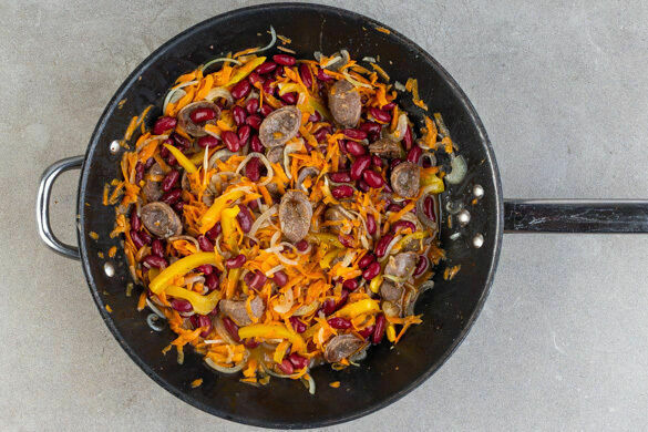 Die Wurstscheiben in einer großen Pfanne mit 3–4EL Olivenöl bei starker Hitze ca. 2Min. scharf anbraten. Die Zwiebeln, den Knoblauch, die Karotten und die Paprika zugeben und 2–3Min. mitbraten. Dann die Gewürzmischung unterrühren und mit den Bohnen samt Flüssigkeit ablöschen. Das Gemüse und die Wurst noch 2–3Min. köcheln lassen.