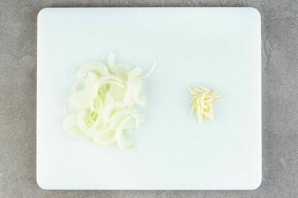Die Zwiebel schälen, halbieren und in feine Streifen schneiden. Den Knoblauch schälen und in dünne Stifte schneiden.