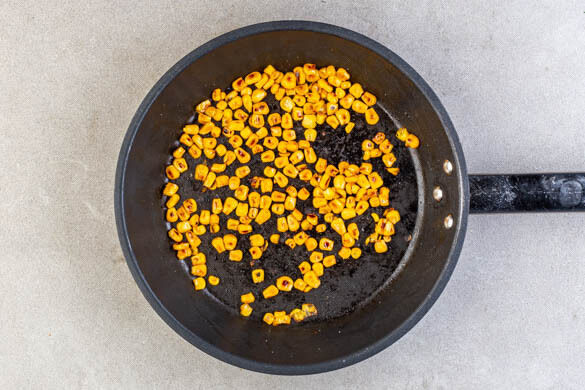 Die restlichen Maiskörner in einer mittelgroßen Pfanne mit ½EL Olivenöl und 1 Prise Salz bei starker Hitze 1–2Min. rösten, dann wenden und ca. 1Min. weiterrösten, bis sie von beiden Seiten kräftig gebräunt sind. Die Maiskörner aus der Pfanne nehmen und beiseitestellen.
