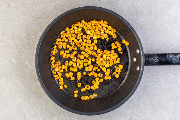 Die restlichen Maiskörner in einer großen Pfanne mit 1EL Olivenöl und 1 kräftigen Prise Salz bei starker Hitze 1–2Min. rösten, dann wenden und ca. 1Min. weiterrösten, bis sie von beiden Seiten kräftig gebräunt sind. Die Maiskörner aus der Pfanne nehmen und beiseitestellen.