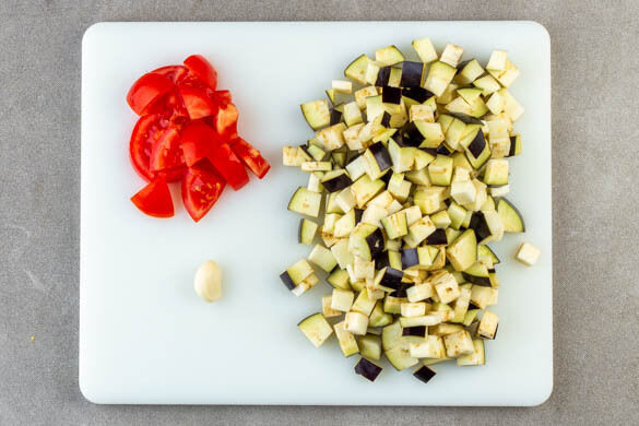 Die Aubergine in ca. 1cm große Würfel schneiden. Die Tomaten in 2–3cm große Stücke schneiden und den Knoblauch schälen.