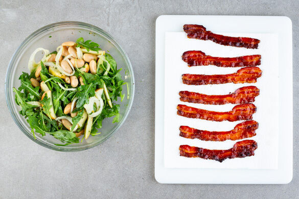 Salat ist Kaninchenfutter? Na, dann hast du wahrscheinlich noch nicht diesen Leckerbissen probiert, der mit ganz viel geschmacklichem Kawumm daherkommt und auch optisch eine überaus gute Figur auf deinem Teller macht! Die Grundlage bieten nebst nussigem Rucola eine Mischung aus aromatischem Fenchel, Bohnen und knusprigem Speck. Dazu gibt es fruchtige Apfelstückchen, Haselnüsse und ein leckeres Dressing!