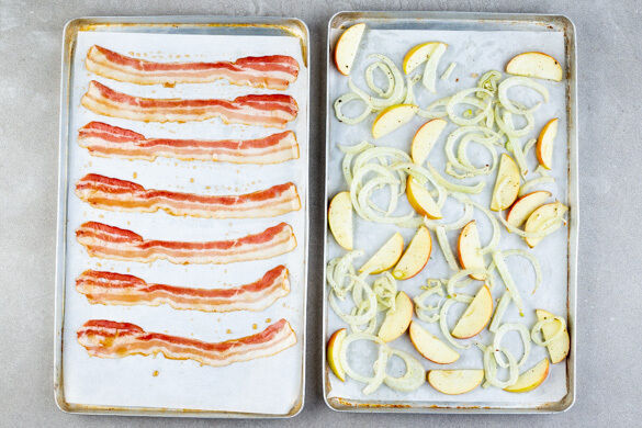 Den Fenchel und die Äpfel auf einem mit Backpapier ausgelegten Backblech mit 2EL Olivenöl und je 1/2TL Salz und Pfeffer vermengen, gleichmäßig verteilen und ca. 5Min. im Ofen backen. Den Speck auf einem zweiten mit Backpapier belegten Blech auslegen und mit dem Ahornsirup beträufeln. Über dem Gemüse in den Ofen schieben und alles weitere 10Min. backen.