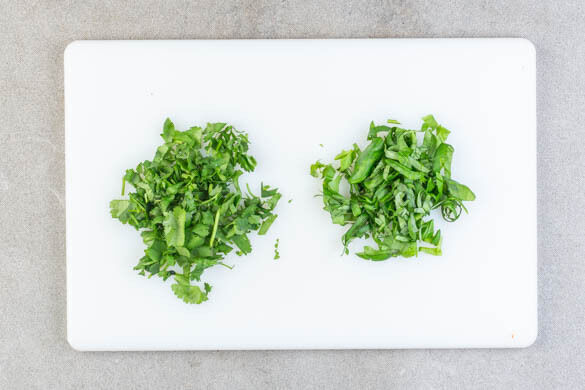 Die Basilikumblätter abzupfen, dann mit dem Koriander samt Stängeln grob schneiden.