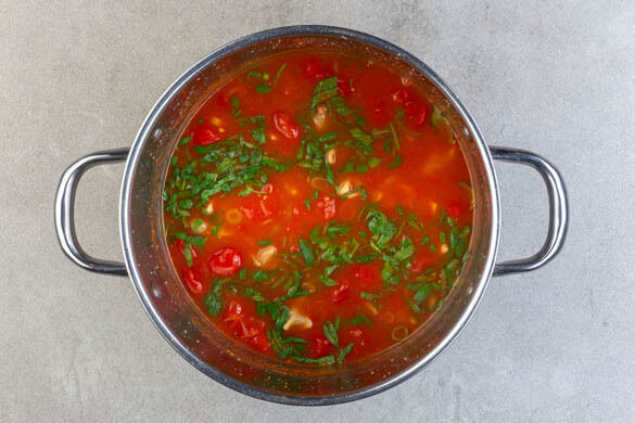 Die Manti in die Suppe geben und einmal aufkochen lassen, dann bei geringer Hitze 1–3Min. sanft köcheln lassen. Anschließend vom Herd nehmen. Tipp: Der Mantiteig sollte bissfest sein und wird weicher, während die Suppe zieht.