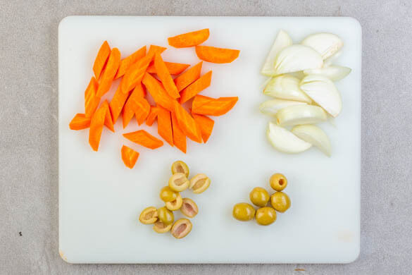 In einem mittelgroßen Topf 800ml leicht gesalzenes Wasser für den Perlencouscous zum Kochen bringen. Die Zwiebeln schälen, halbieren und in dicke Scheiben schneiden. Die Karotten ggf. schälen, längs halbieren und schräg in ca. 1cm dicke Scheiben schneiden. Die ½ der Oliven längs halbieren, die restlichen Oliven für Schritt 5 aufbewahren.