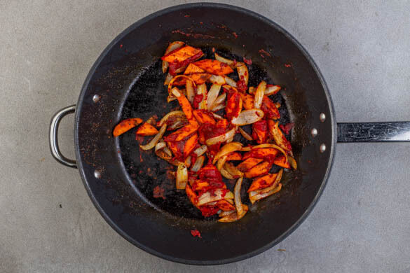 Die Zwiebeln und die Karotten in einer großen Pfanne mit 2EL Olivenöl bei mittlerer bis starker Hitze in ca. 3Min. braten, bis das Gemüse zu bräunen beginnt. Die Gewürzmischung und das Tomatenmark unterrühren und bei mittlerer Hitze ca. 3Min. mitbraten, bis die Gewürze duften und das Tomatenmark eine dunklere Farbe annimmt.