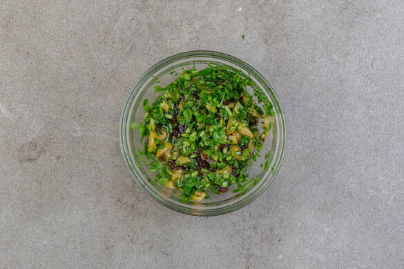 Die restlichen Oliven und die restlichen Rosinen grob schneiden. Den Koriander und die Petersilie samt Stängeln fein schneiden. Die Oliven, Rosinen und Kräuter in einer Schüssel mit je 3EL Olivenöl und Essig zu einer stückigen Sauce verrühren und mit Salz und Pfeffer abschmecken.